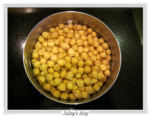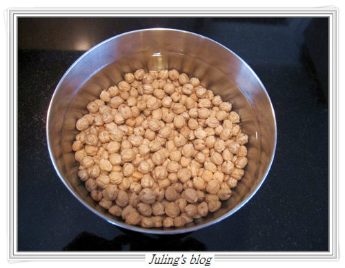 1. 鷹嘴豆加入2杯的水泡8小時,(我都是前一天晚上泡水,隔天再入電鍋中蒸熟)