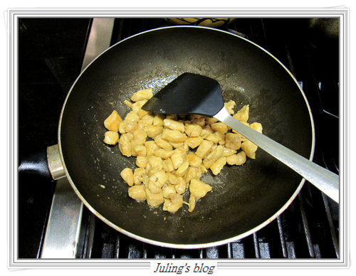 6. 鍋中入油,放入雞肉炒熟後,先盛出備用.