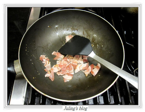 7. 放入培根炒香.