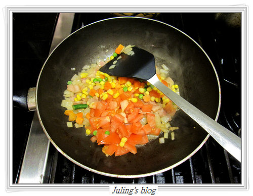 9. 加入蕃茄及3色蔬菜拌炒.
